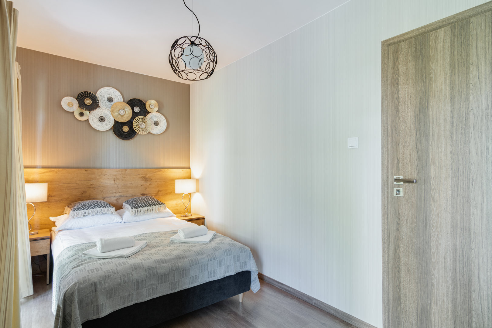 Sypialnia z dużym łóżkiem z podwójnym materacem, stoliki nocne, szafa, biurko, krzesło, wyjście na taras.