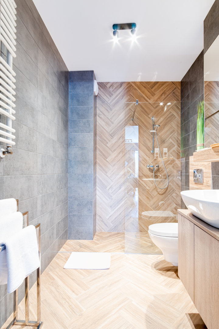 Łazienka z prysznicem, umywalką i wc.