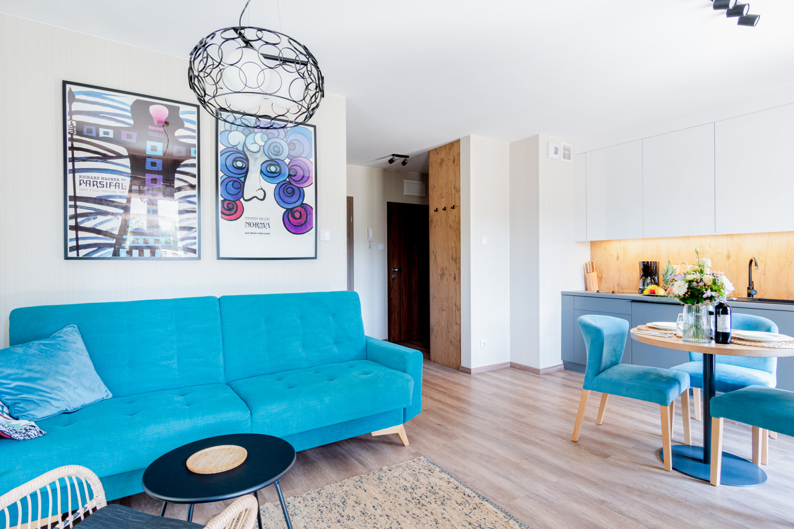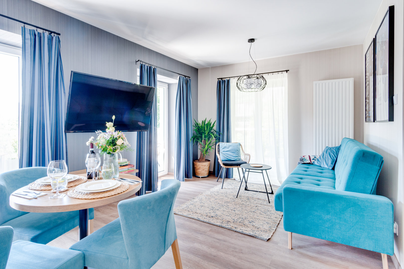 Salon z rozkładaną wersalką, stół z krzesłami, stolik kawowy, TV, wyjście na duży taras