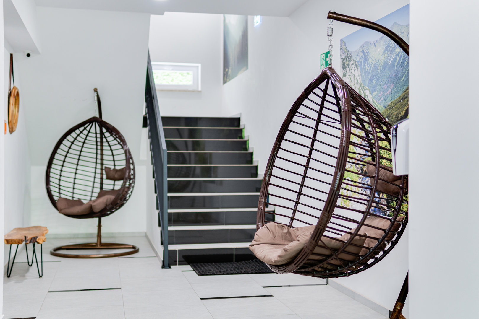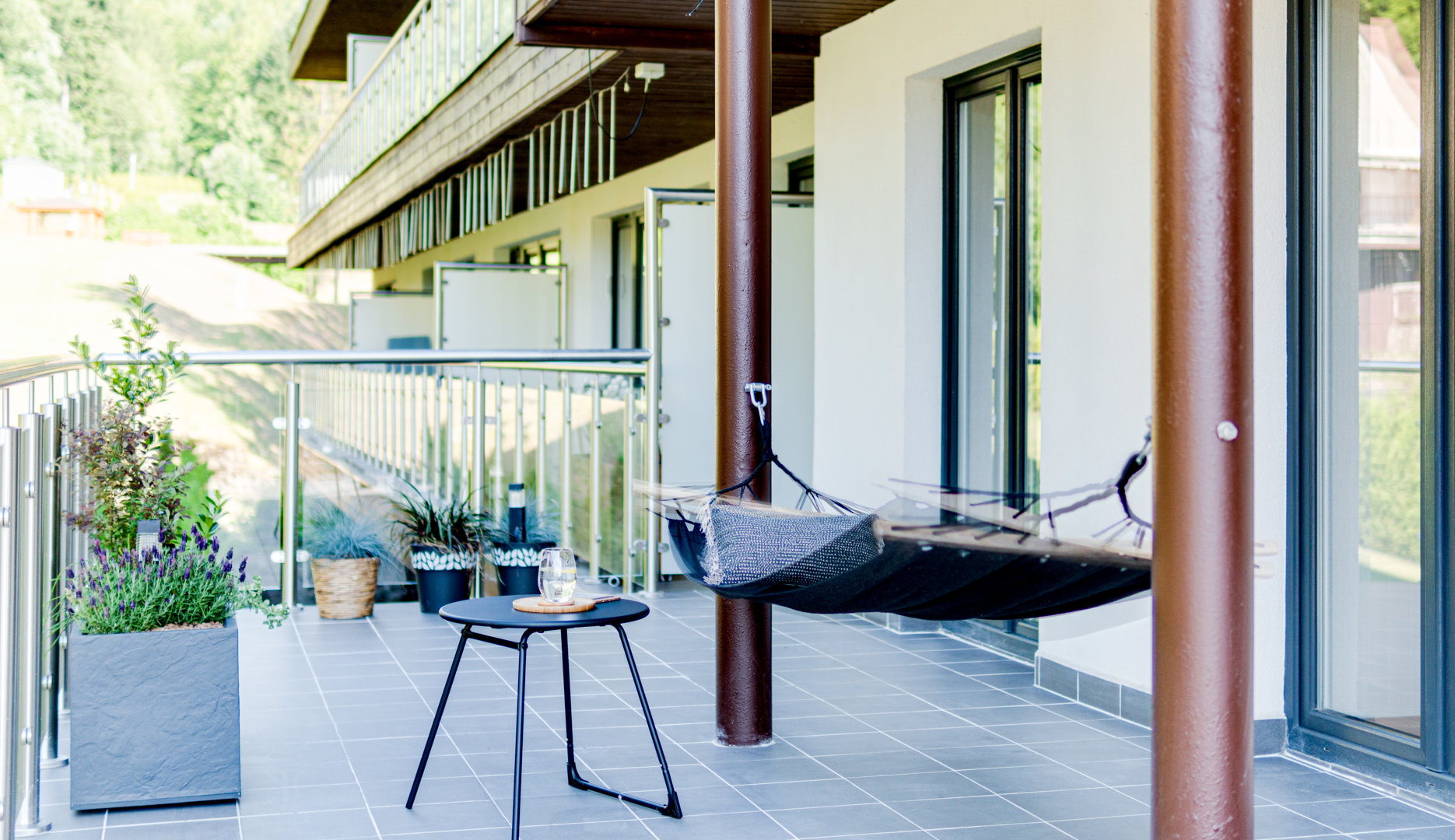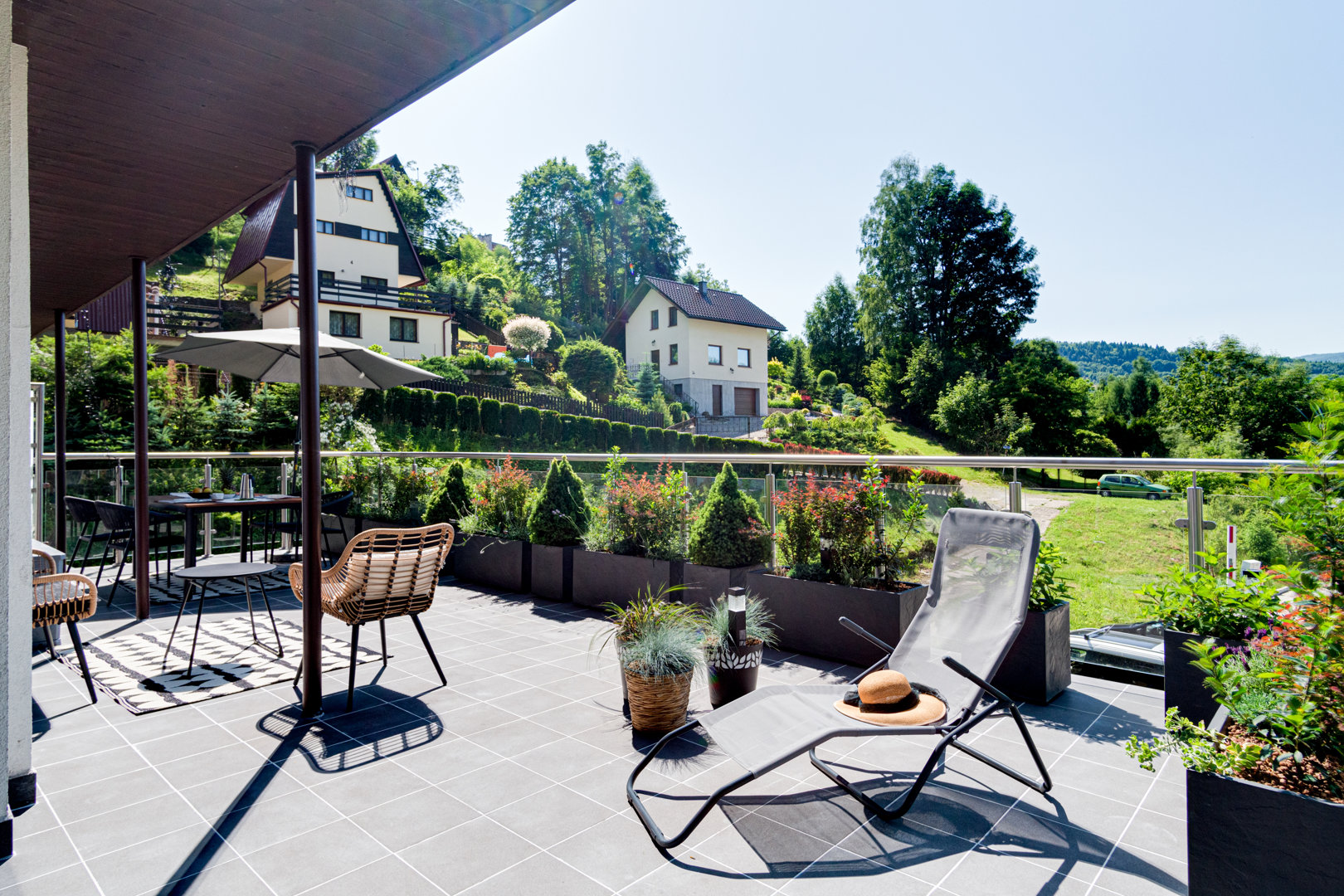 Taras z widokiem na góry posiada wygodne meble ogrodowe: duży stół z krzesłami z parasolem, meble rattanowe wypoczynkowe, 2 leżaki, hamak. Liczne donice z roślinami zapewniają intymność i relaks.